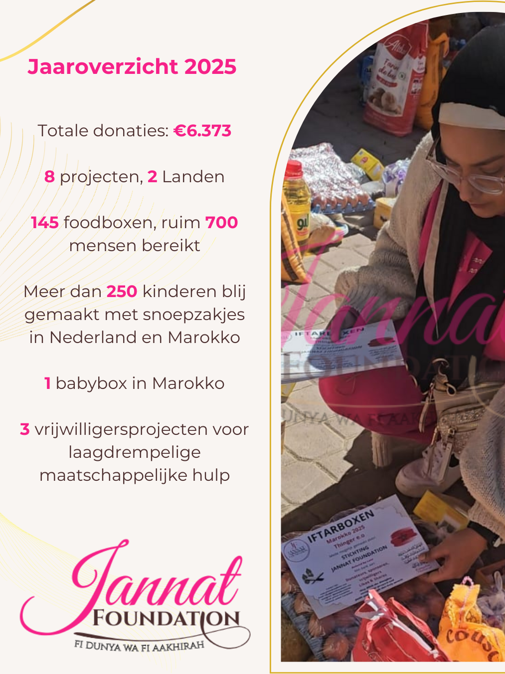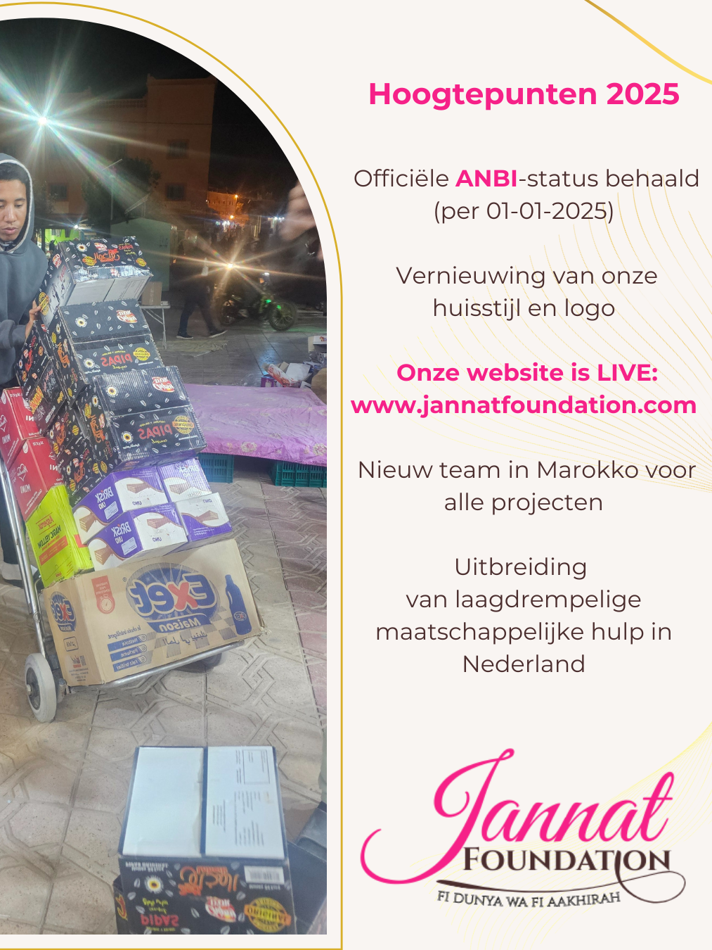 Sinds 2023 zet Jannat Foundation zich in voor hulp met impact. Met liefde, zorg en echte betrokkenheid ondersteunen we kwetsbaren met voedsel, onderwijs en maatschappelijke hulp, waar het nodig is, wanneer het nodig is.