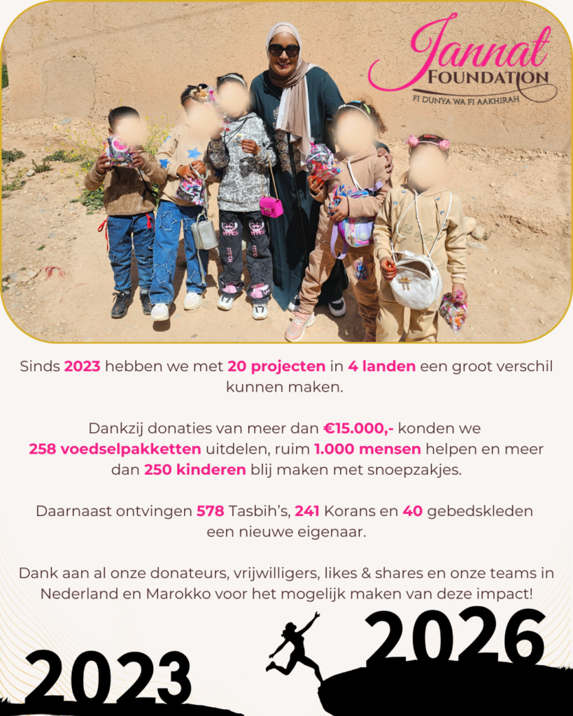 Wij zijn dankbaar voor het vertrouwen van onze donateurs, de inzet van vrijwilligers en de toewijding van onze teams in Nederland en Marokko, die dit werk mogelijk maken.