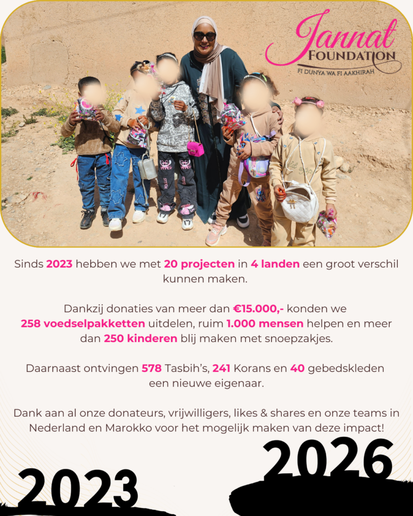 Wij zijn dankbaar voor het vertrouwen van onze donateurs, de inzet van vrijwilligers en de toewijding van onze teams in Nederland en Marokko, die dit werk mogelijk maken.