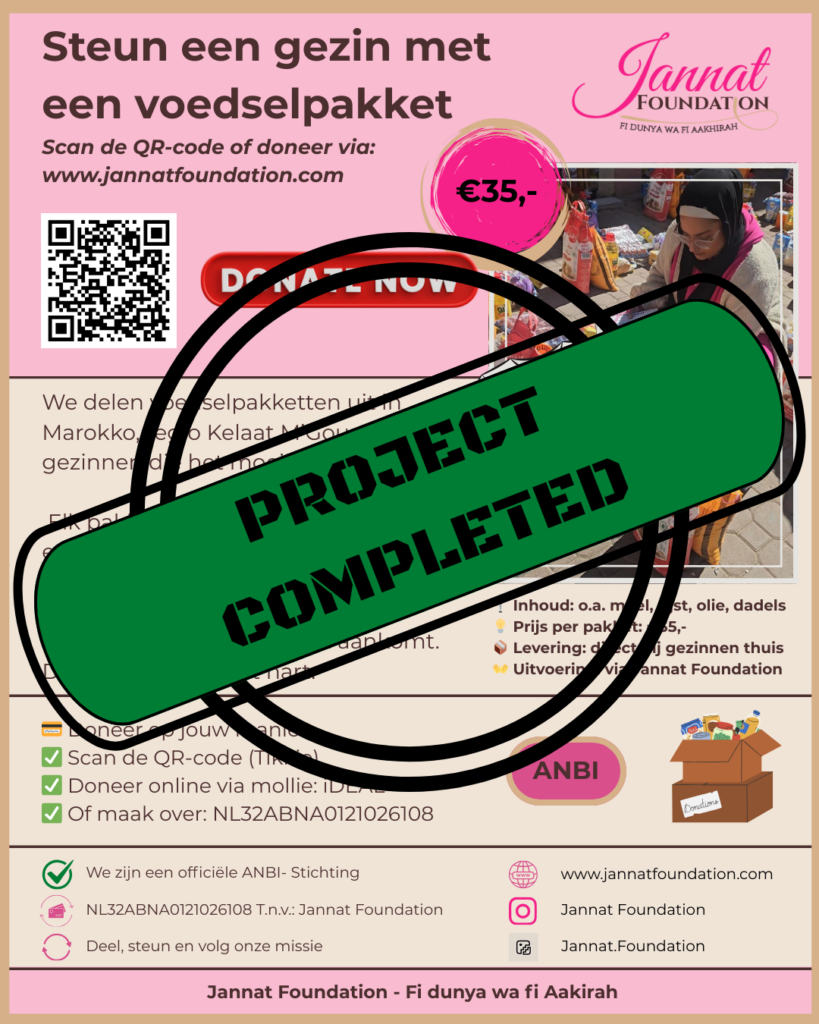 Met jouw donatie steun je de projecten van Jannat Foundation. Je kiest het project en het bedrag. Wij zetten jouw bijdrage in waar die nodig is.